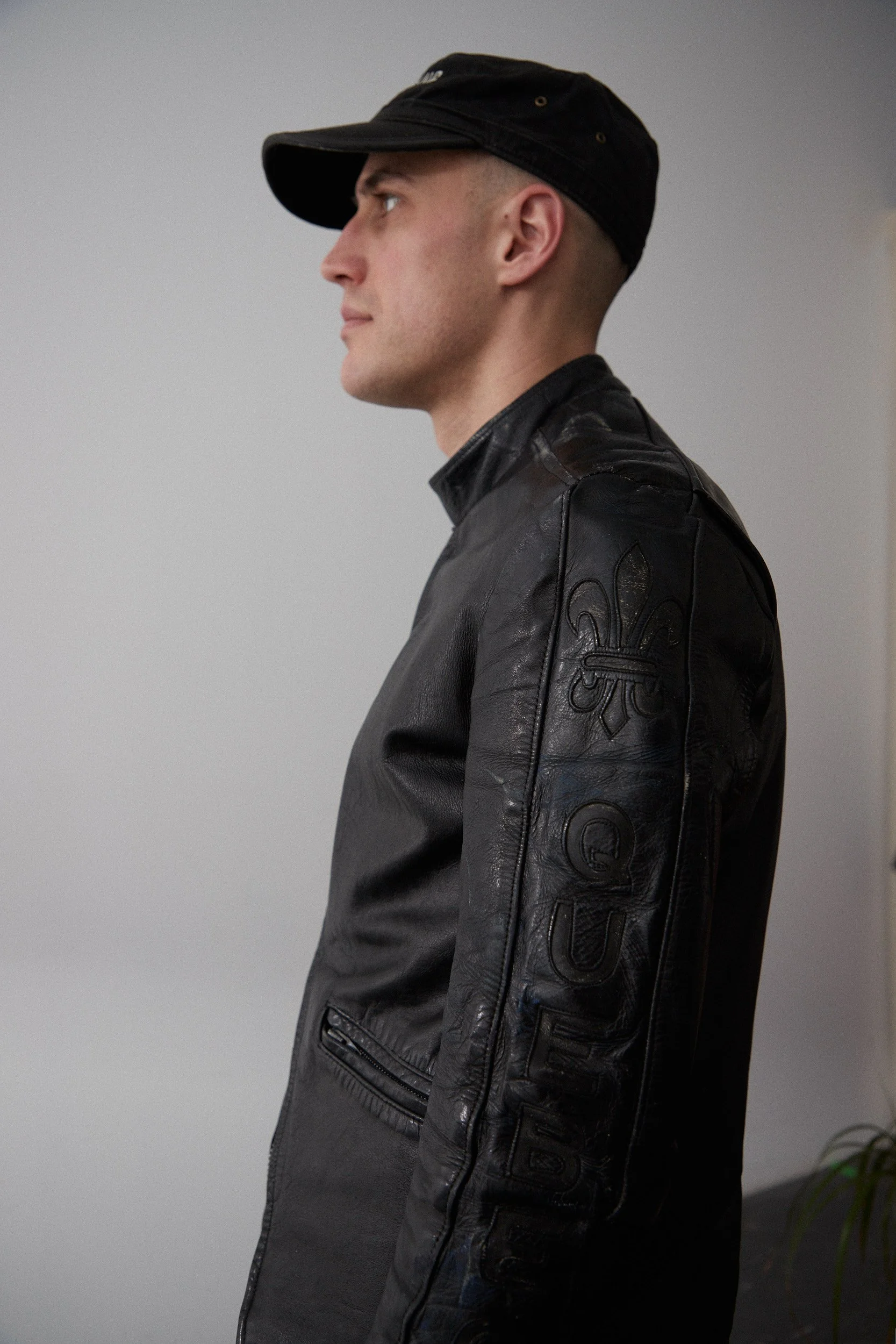 Cafe Racer with "QUEBEC" stencil detailing on sleeves. Roughly 50 years old this jacket is in pretty good condition with some natural wear and tear as per the photos. The Quebec panel would have initally been blue but has been customized and painted over with black leather paint. The bottom part of the two-way zipper is missing the puller tab. Lining is in tact- was probably re-lined. Despite the missing main label, we’re 99% positive this is a BRIMACO. No one else in Canada was manufacturing this type of cafe racer with Lightning zippers and graphic stenciling on sleeves. The made-in-Canada and leather care label is still present.